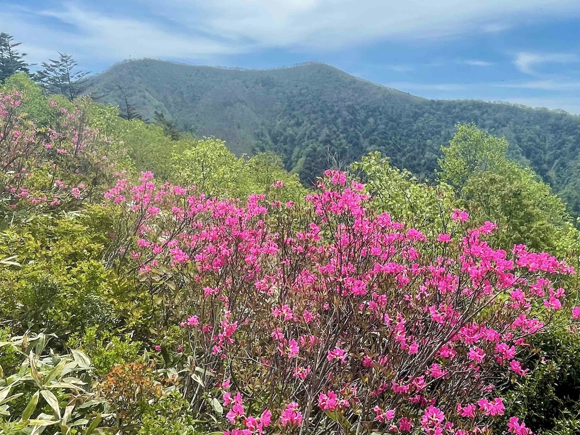 新緑と春の花咲く飯縄山と瑪瑙(めのう)山
