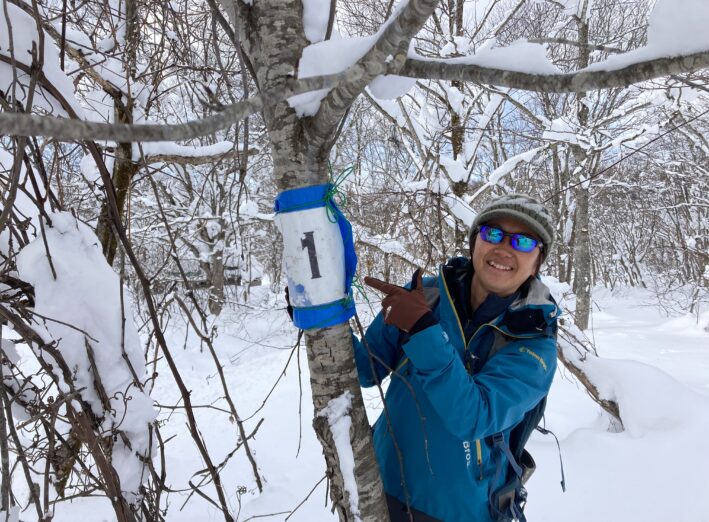 今シーズンは前半の降雪が少なく、藪や沢が十分に埋まっていなかったためスノーシューコースの設置ができておりませんでしたが、ここ数日の大雪によりようやくビジターセンターに隣接する「ホンドリスコース」を本日設置することができました。