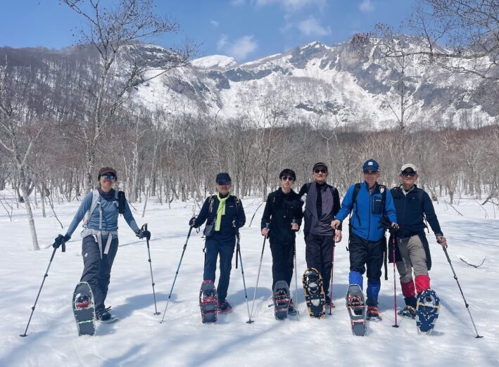 朝から気温が上がって、とても穏やかな3月最終の日曜日となっています。春の暖かさを感じ取ったスギたちが一斉に花粉を飛ばしているからでしょうか? 妙高山が春霞に包まれています。本日をもちまして、赤倉山南麓巨木の森スノーシューおよび深雪スノーシュー散歩を終了します。最終回はまさに有終の美を飾る天気となりホッとしました。今シーズンも多くの方にご参加いただき、本当にありがとうございました!