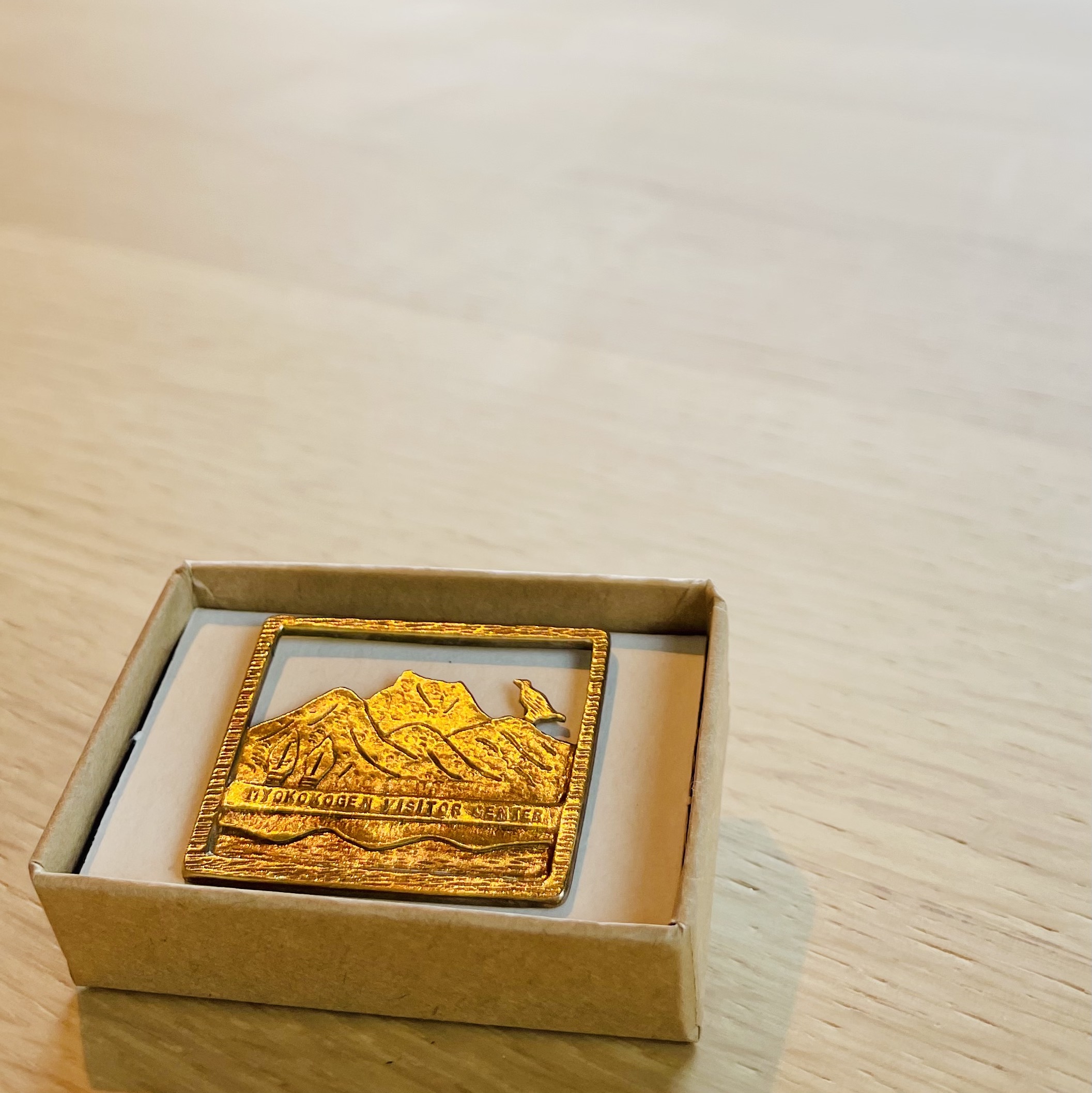 山バッジ作家で人気のmauve・山本葵さんに当センターのオリジナルバッジを制作してもらいました。ビジターセンターの大きな窓から望む妙高山に、風が凪いだ「いもり池」に映り込む逆さ妙高。多くの鳥が飛来するエリアの象徴として、外輪山の上にはノジコがちょこんと止まって羽を休めています。池のほとりにはミズバショウも刻まれています。妙高方面へお越しの際は、妙高高原ビジターセンターにお立ち寄り下さい。