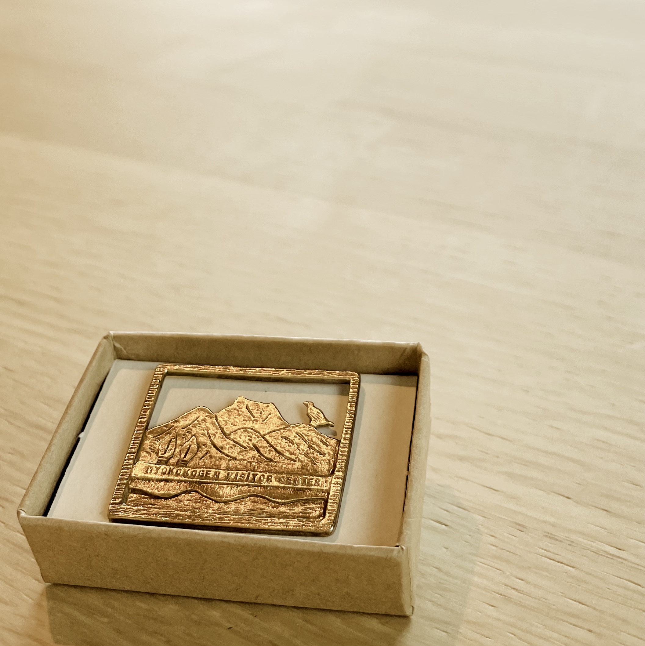 山バッジ作家として人気のmauve・山本葵さんに当センターのオリジナルバッジを制作してもらいました。ビジターセンターの大きな窓から望む妙高山に、風が凪いだ「いもり池」に映り込む逆さ妙高。多くの鳥が飛来するエリアの象徴として、外輪山の上にはノジコがちょこんと止まって羽を休めています。池のほとりにはミズバショウも刻まれています。